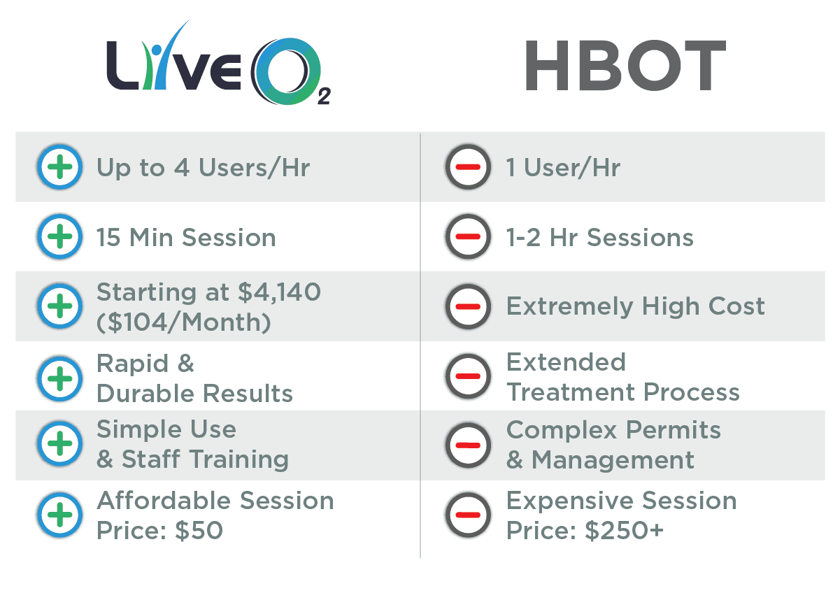 LiveO2 was an absolute game changer for my practice. We started getting much earlier results especially with brain trauma, fatigue, and people who were decondition and in pain. With the LiveO2 system we get an immediate inflammation reduction. It’s a very effective, safe, and natural way to stay healthy.”